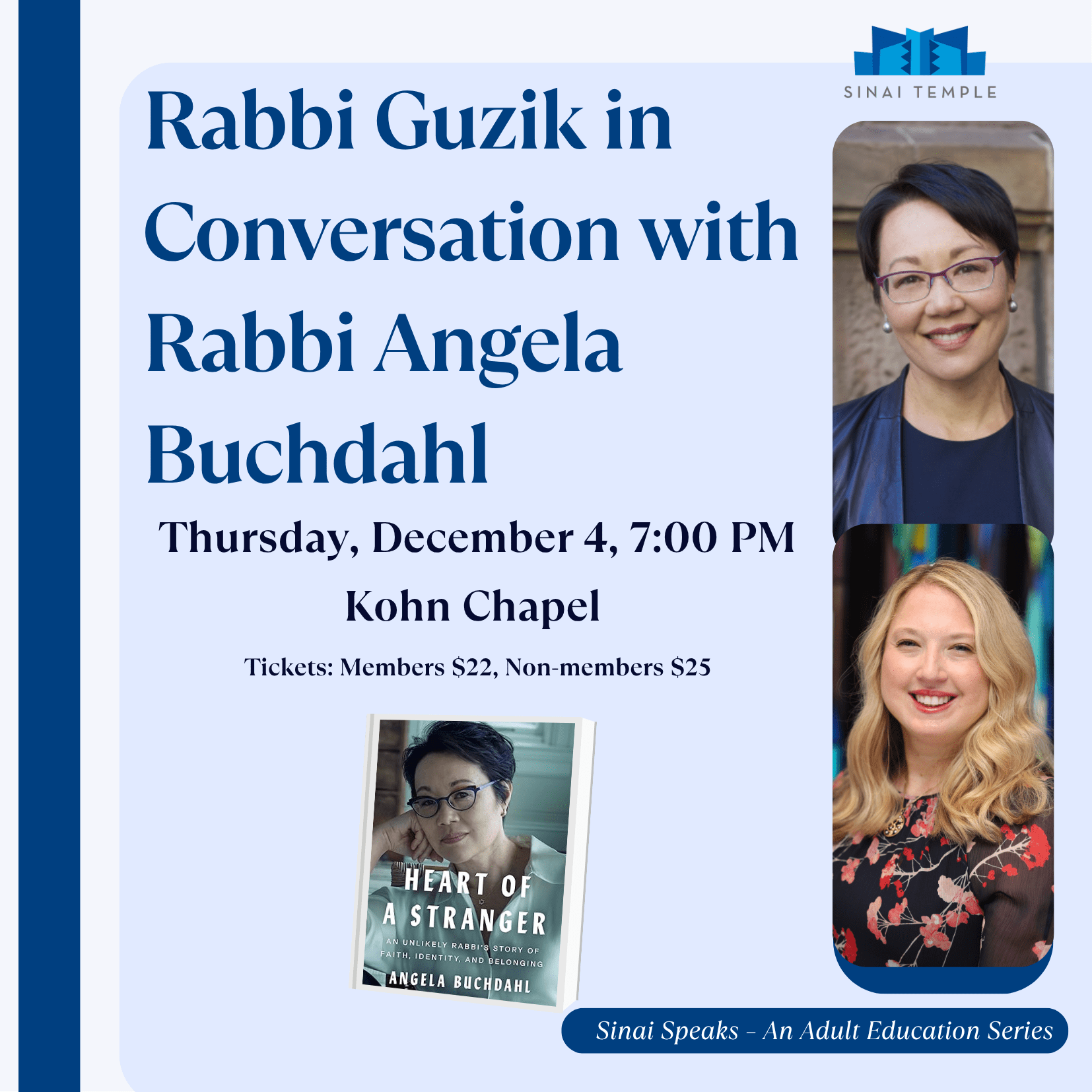 Thursday, December 4 | 7:00 PM Co-Senior Rabbi Nicole Guzik will speak with Rabbi Angela Buchdahl on Heart of a Stranger: An Unlikely Rabbi’s Story of Faith, Identity, and Belonging, recently featured on The New York Times Best Seller list....