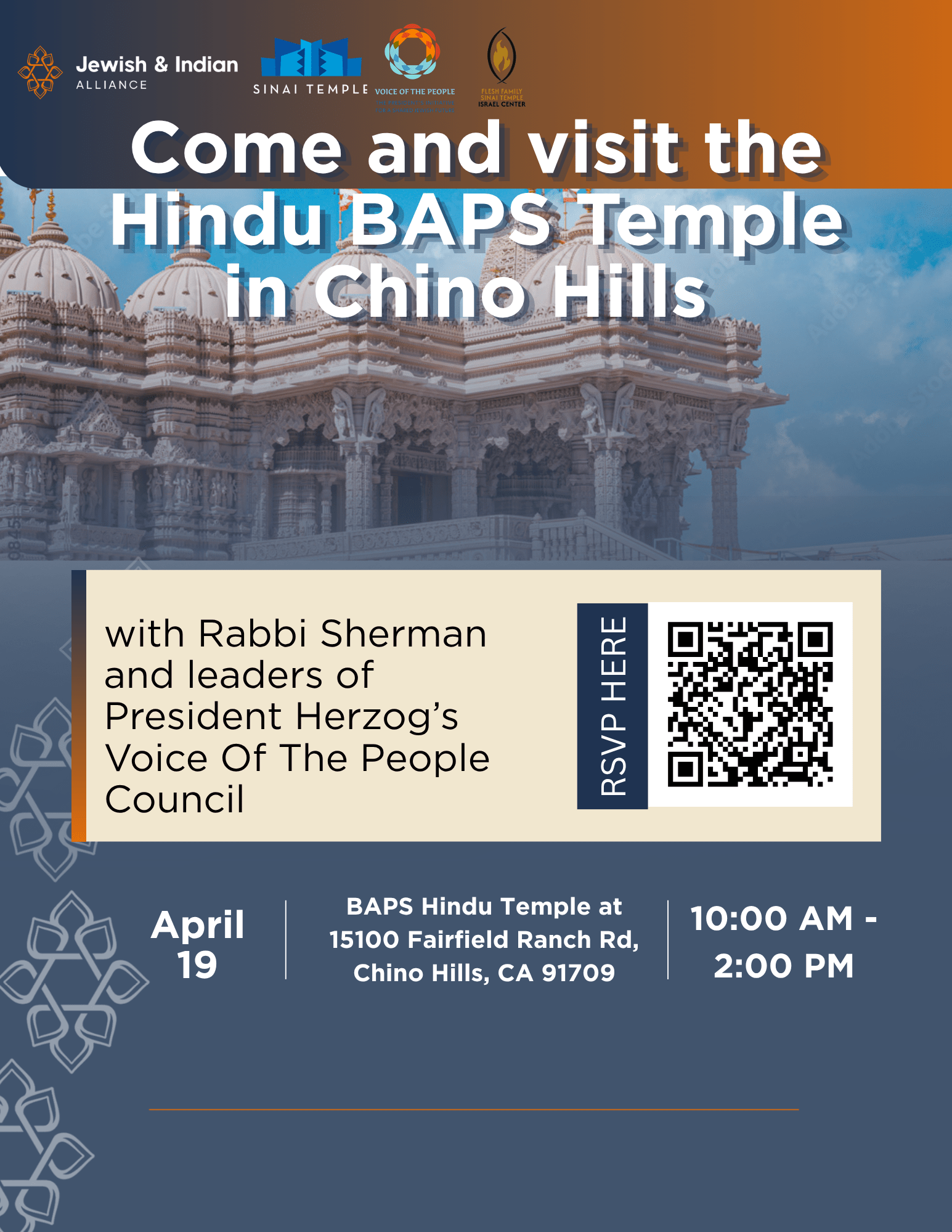 Sunday, April 19, 2026 | 10:00 AM-2:00 PM with Rabbi Sherman and leaders of President Herzog’s Voice Of The People Council BAPS Hindu Temple at 15100 Fairfield Ranch Rd, Chino Hills, CA 91709 RSVP HERE
