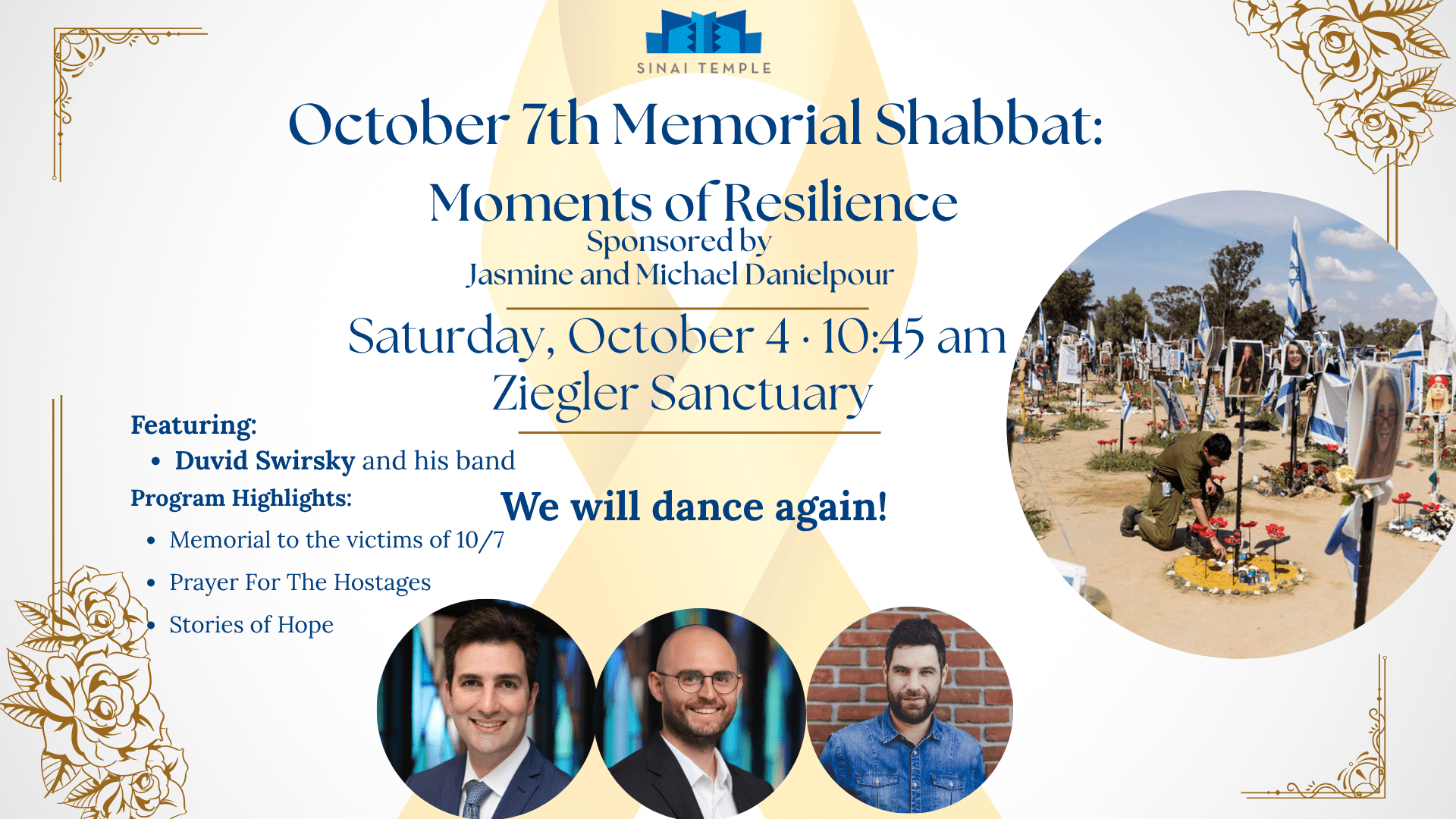 Sponsored by Jasmine and Michael Danielpour Saturday, October 4 · 10:45 am | Ziegler Sanctuary Featuring: Duvid Swirsky and his band Program Highlights: Memorial to the victims of 10/7 Prayer For The Hostages Stories of Hope