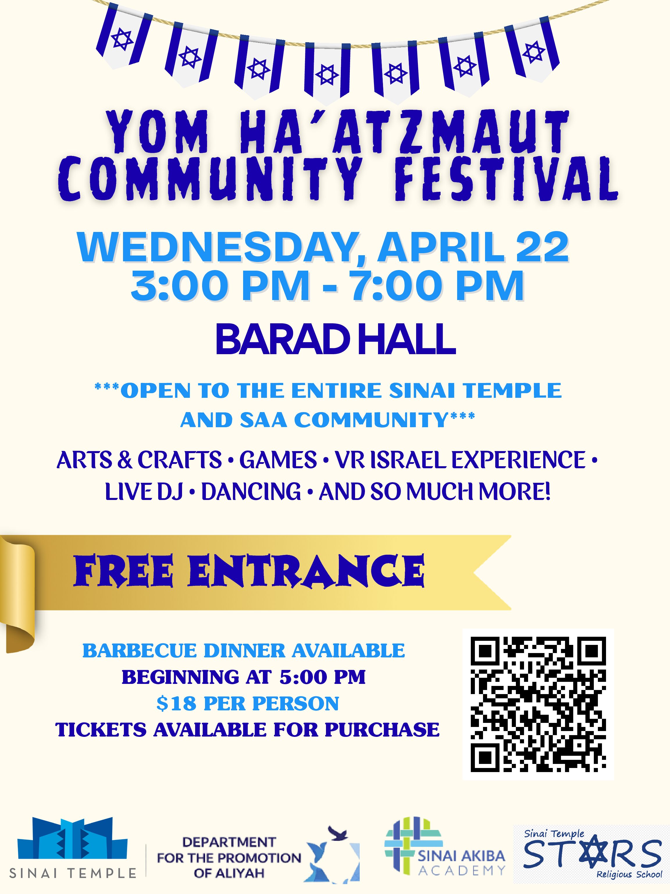 Wednesday, April 22, 20263:00 PM – 7:00 PM Location:Barad Hall| Sinai Temple Open to the entire Sinai Temple and SAA community Enjoy: Arts & Crafts Games VR Israel Experience Live DJ Dancing And so much more! Free Entrance Barbecue Dinner...