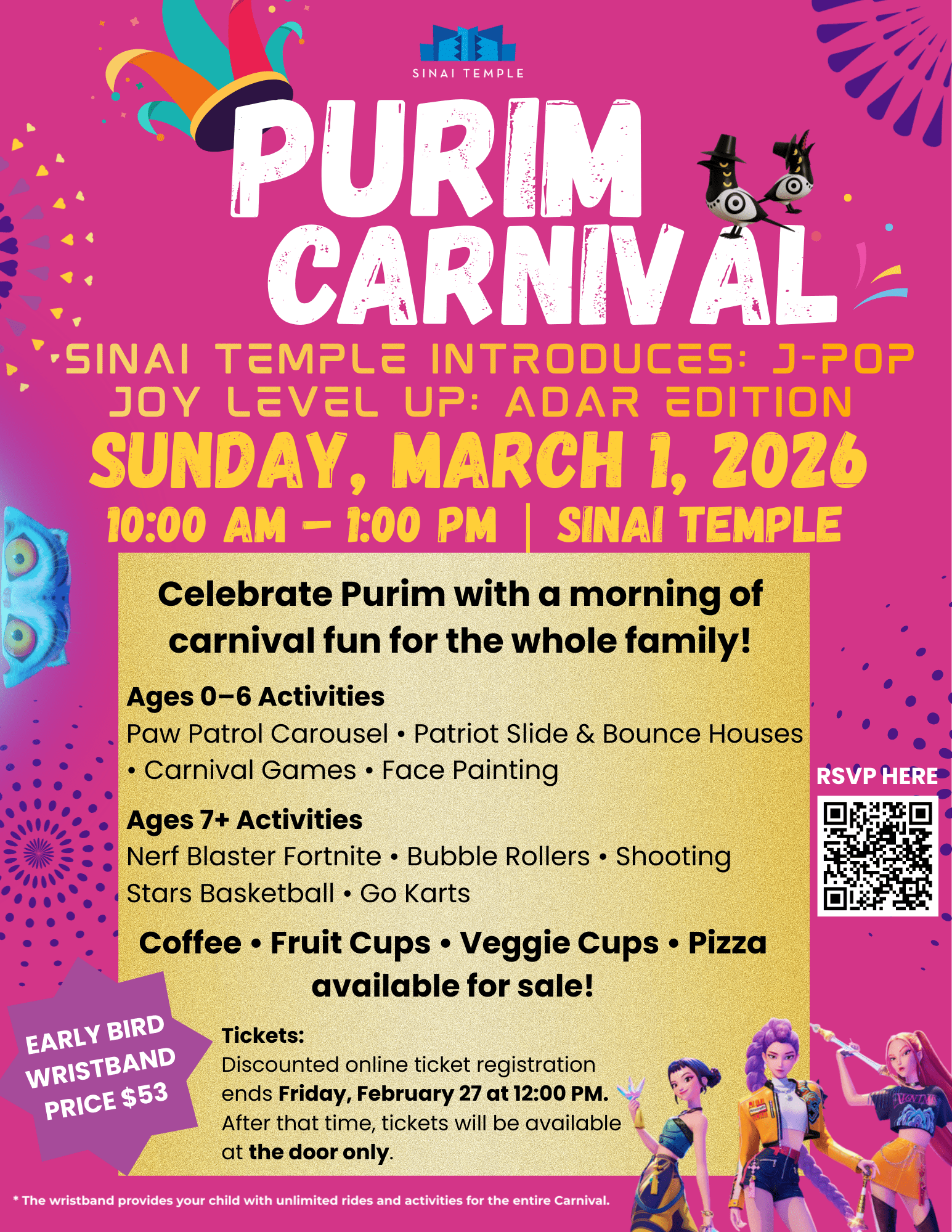 Sinai Temple Introduces: J-Pop Joy Level Up: Adar Edition Sunday, March 1, 202610:00 AM to 1:00 PM Celebrate Purim with a morning of carnival fun for the whole family. PricingEarly Bird Wristband Price: $53Discounted online ticket registration ends Friday, February...