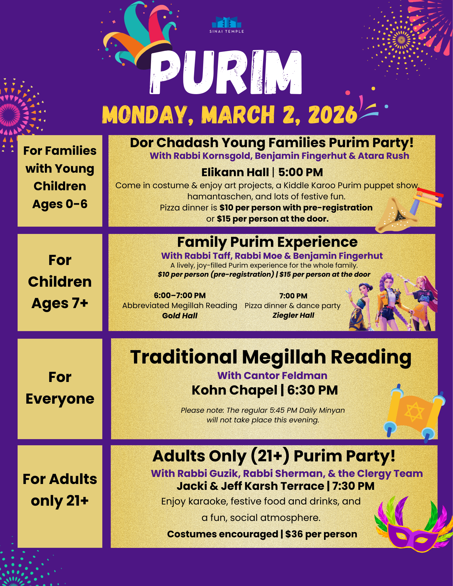 Monday, March 2, 2026 Celebrate Purim at Sinai Temple with programs for all ages throughout the evening, including family celebrations, a traditional Megillah reading, and an adults-only Purim party. Events are designed for young families, older children, adults, and the...