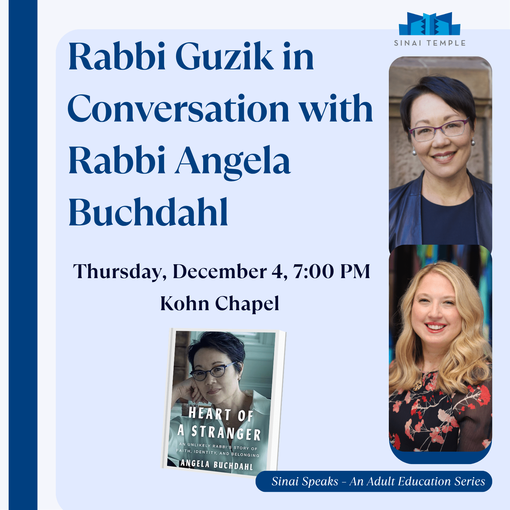 Thursday, December 4 | 7:00 PM Co-Senior Rabbi Nicole Guzik will speak with Rabbi Angela Buchdahl on Heart of a Stranger: An Unlikely Rabbi’s Story of Faith, Identity, and Belonging, recently featured on The New York Times Best Seller list….