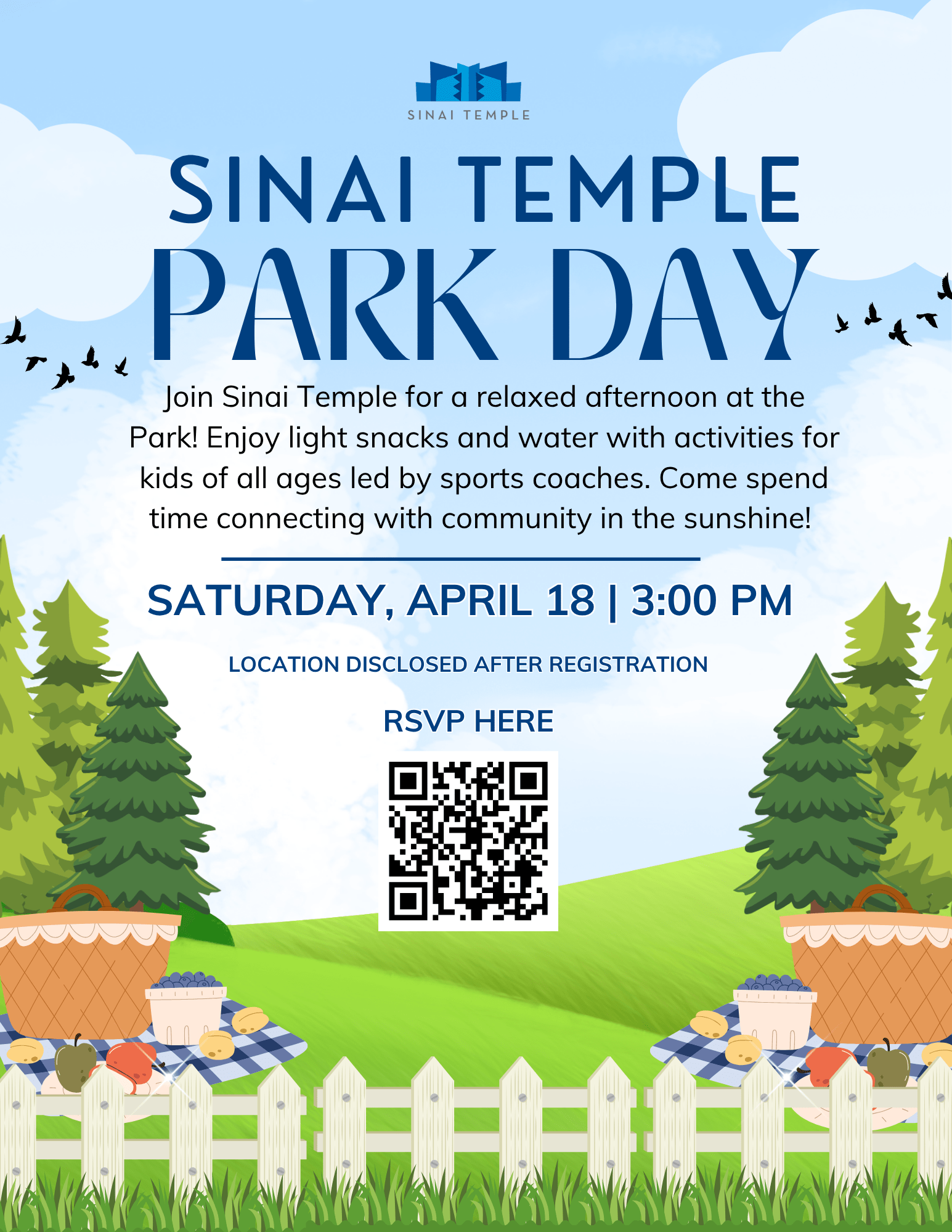 Saturday, April 18 | 3:00 Pm Location Disclosed After Registration Join Sinai Temple for a relaxed afternoon at the Park! Enjoy light snacks and water with activities for kids of all ages led by sports coaches. Come spend time connecting…