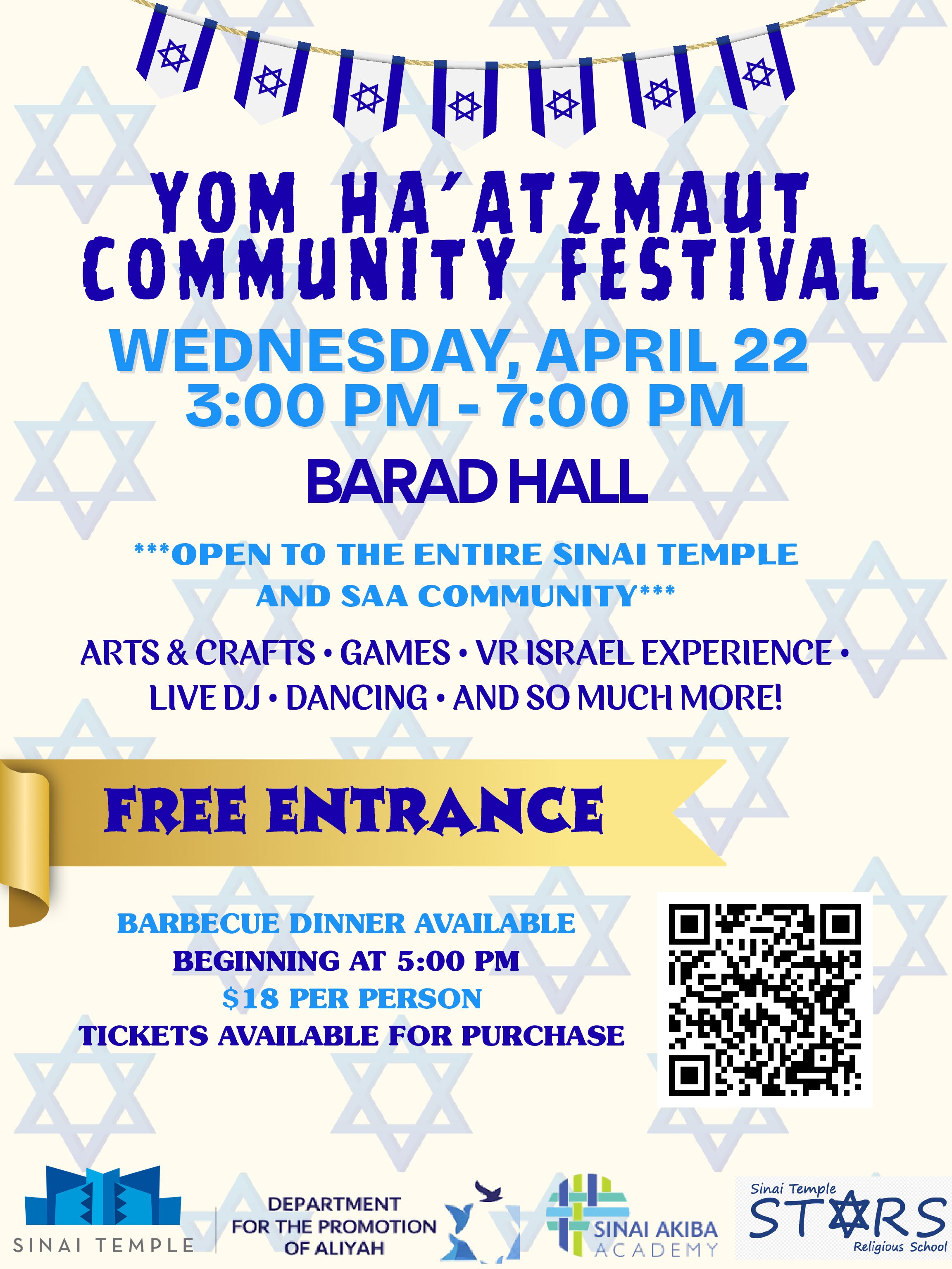 Wednesday, April 22, 20263:00 PM – 7:00 PM Location:Barad Hall| Sinai Temple Open to the entire Sinai Temple and SAA community Enjoy: Arts & Crafts Games VR Israel Experience Live DJ Dancing And so much more! Free Entrance Barbecue Dinner...