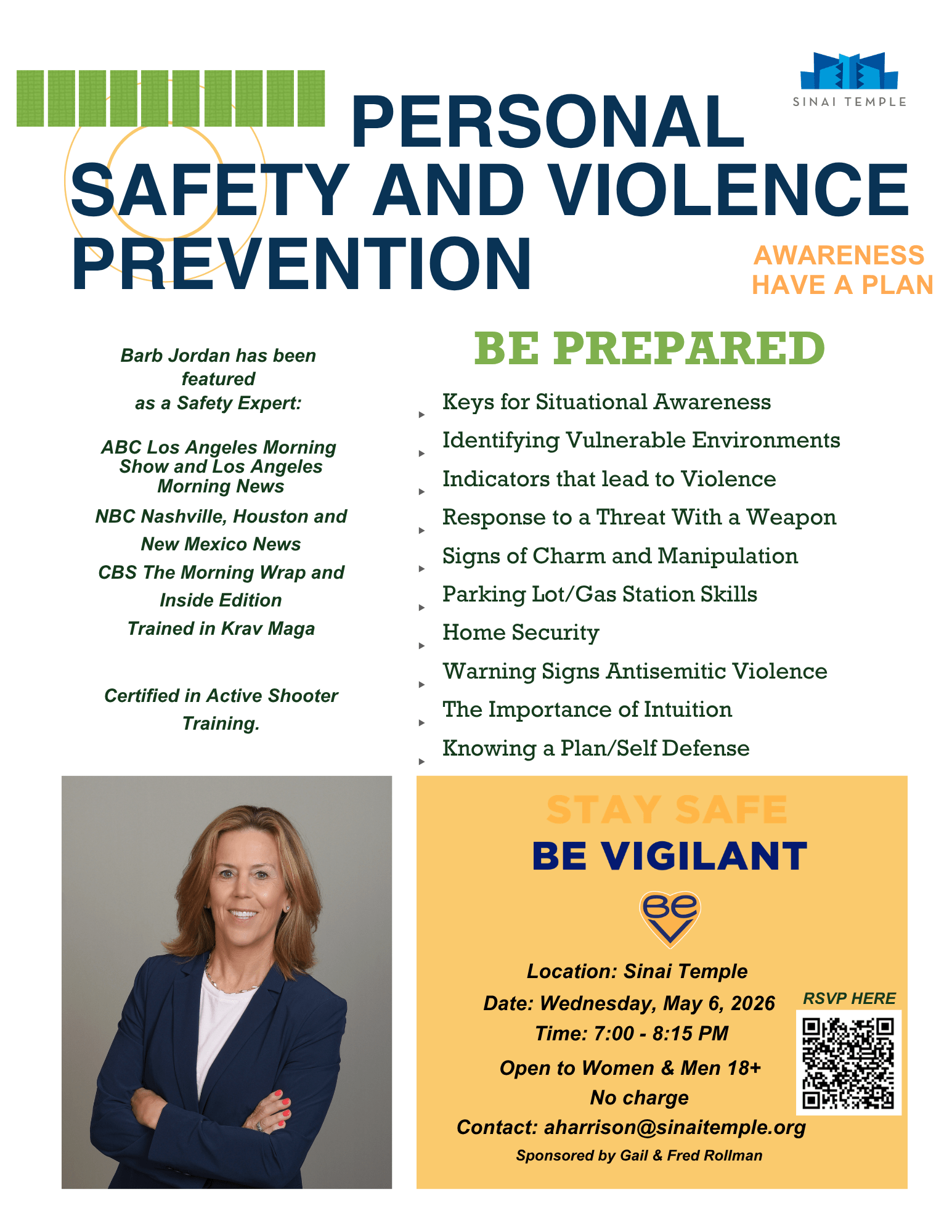 Wednesday, May 6, 2026 Time: 7:00 – 8:15 PM Open to: Women & Men 18+ Cost: No charge Contact: [email protected] Sponsored by: Gail & Fred Rollman Speaker: Barb Jordan — Safety Expert Featured On: ABC Los Angeles Morning Show &…