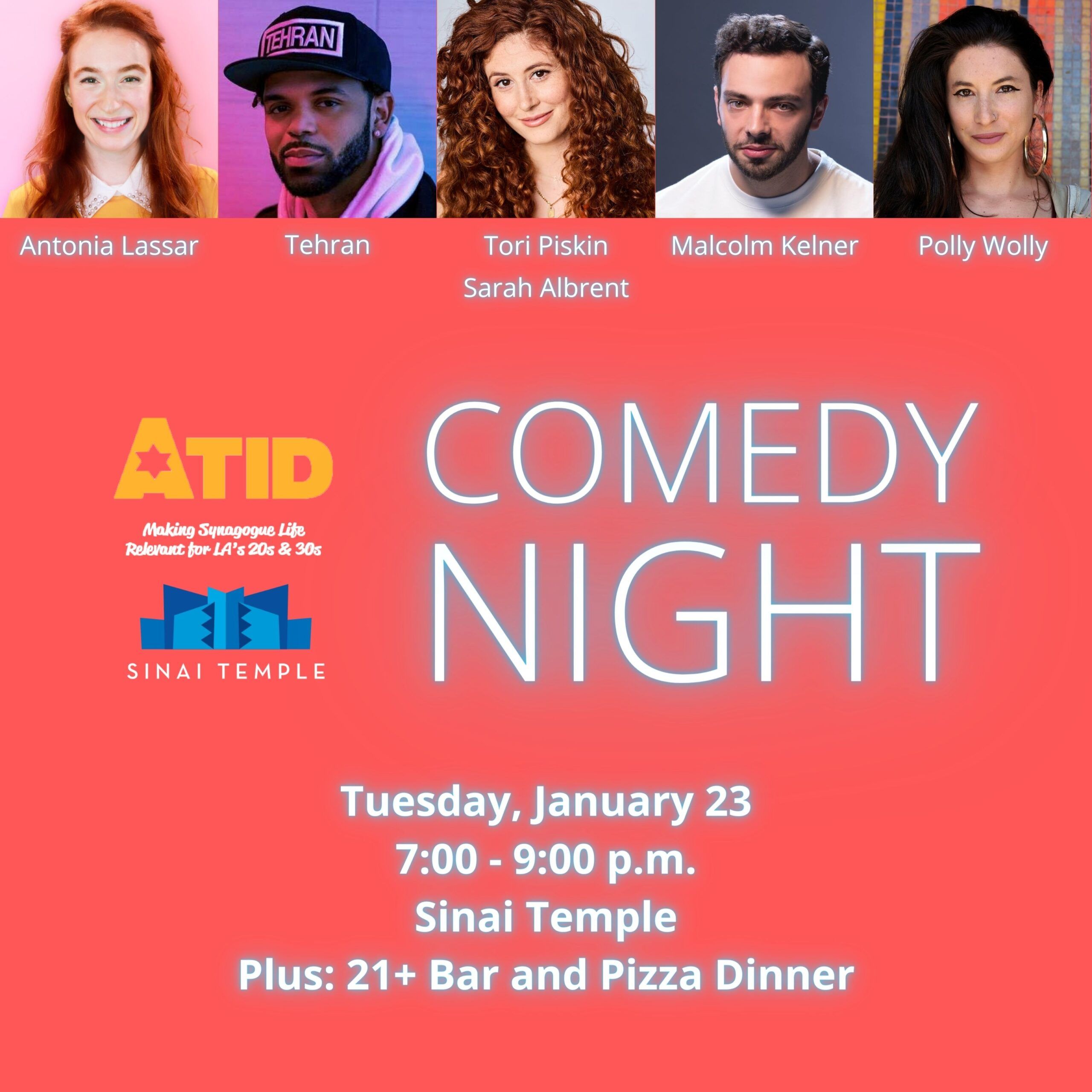 Join us for an unforgettable evening of laughter at Sinai Temple in Gold Hall, featuring comedians Sarah Albrent, Tori Piskin, Malcolm Kelner, Antonia Lassar, and Tehran with legendary MC, Polly Wolly!