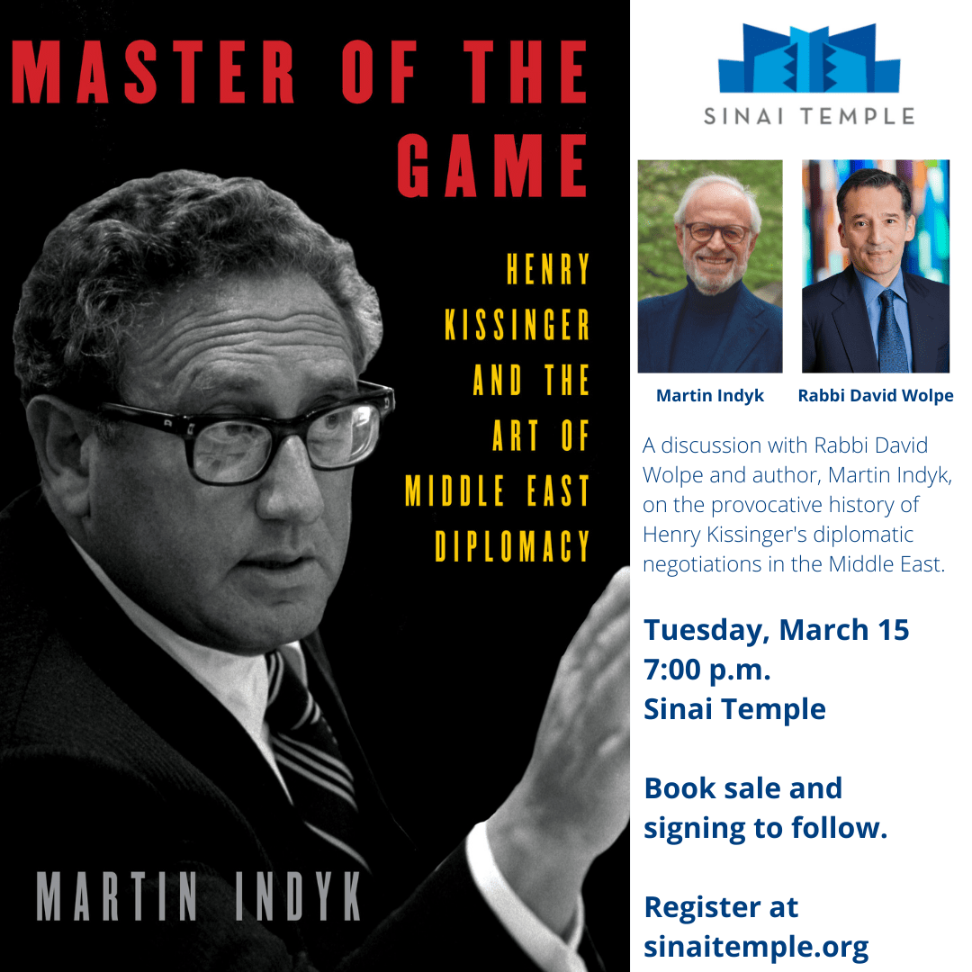 Join us for an insightful and dynamic conversation with Martin Indyk and Rabbi David Wolpe on Indyk’s new book, Master of the Game: A Perceptive and Provocative History of Henry Kissinger’s Diplomatic Negotiations in the Middle East. Book sale and signing to follow.