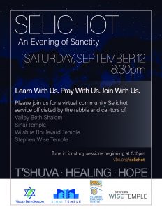 Sinai Temple joins VBS, Wilshire Boulevard Temple and Stephen Wise Temple to present a virtual community Selichot service. Tune in for a meaningful night on our YouTube and Facebook pages. For more info and additional study sessions, click HERE.